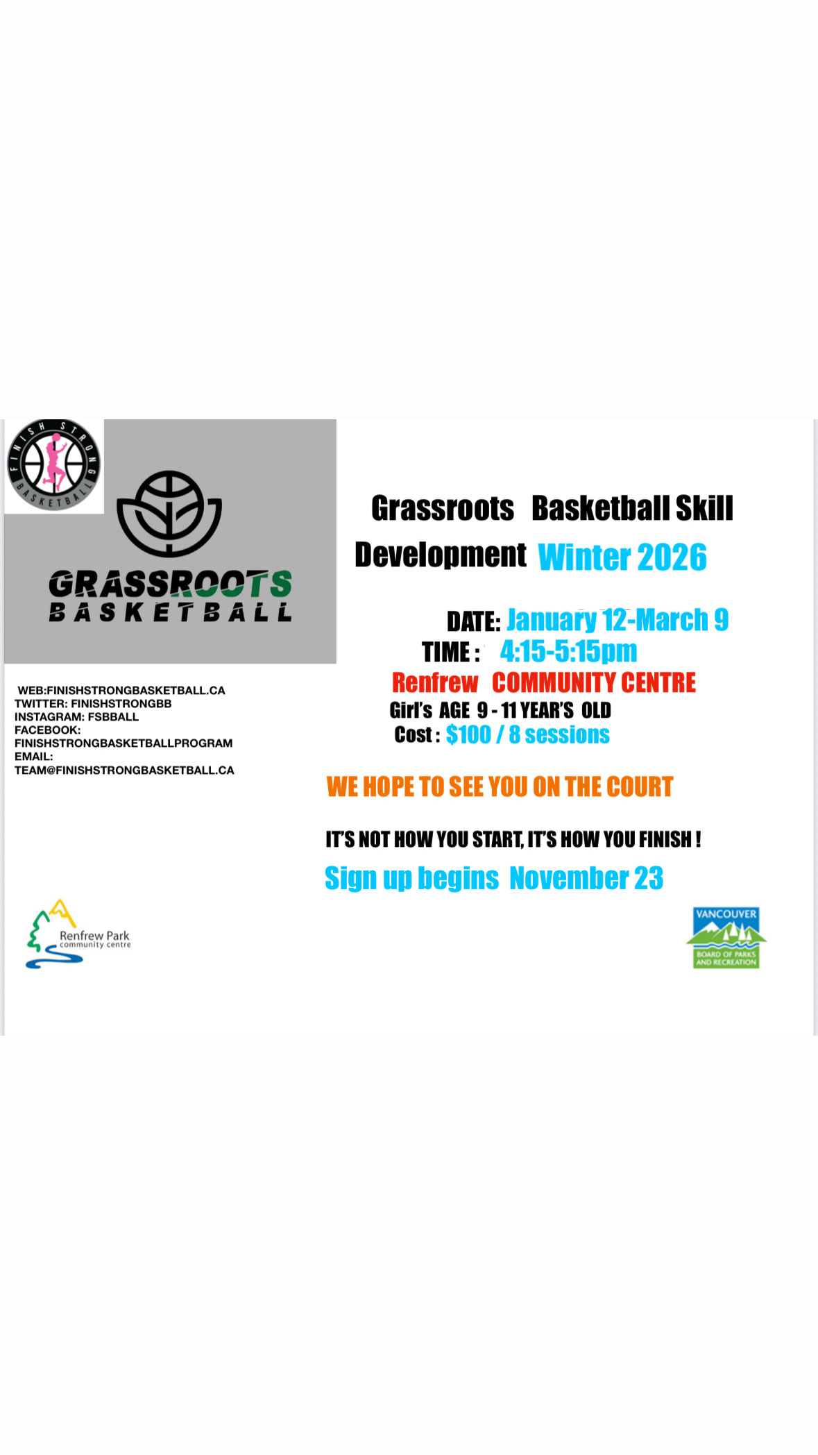 Our girl’s Grassroots basketball skill development program will be back for Winter 2026. If you have any questions contact Renfrew community centre .. Contact (604) 257-8388